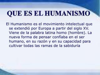El documento resume el movimiento del humanismo durante el Renacimiento. Explica que el humanismo confiaba en la razón y capacidad del ser humano y se extendió por Europa desde el siglo XV. Los humanistas adoptaron el ideal del Renacimiento y se apasionaron por las artes y letras clásicas. El humanismo influyó en la Iglesia cristiana y cuestionó algunas de sus doctrinas, lo que llevó a la división entre católicos y protestantes.