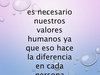 El documento enumera una serie de valores humanos fundamentales como el amor, el respeto, la amistad, la bondad, la dignidad y la generosidad. Argumenta que es necesario rescatar y practicar estos valores en nuestro día a día para hacer la diferencia y cambiar el mundo.