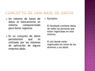 Un sistema de bases de datos es un sistema computarizado para almacenar y gestionar datos de forma persistente. Los sistemas de gestión de bases de datos son software específico que sirve de interfaz entre la base de datos, los usuarios y las aplicaciones. Ejemplos comunes de bases de datos son Facebook, que almacena datos de usuarios, y sistemas escolares que almacenan notas de estudiantes.