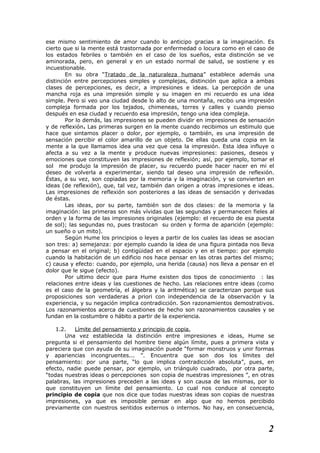 1) Hume analiza los elementos del pensamiento y el conocimiento, distinguiendo entre impresiones e ideas, y estableciendo que la experiencia es la fuente y el límite del conocimiento. 2) Argumenta que aunque el pensamiento parece ilimitado, en realidad está limitado a mezclar y modificar las sensaciones obtenidas de la experiencia. 3) Concluye que la experiencia es necesaria para formar cualquier idea, y que aquellos sin ciertas experiencias sensoriales serán incapaces de imaginar algunas cosas.