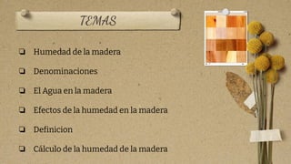 Este documento discute la humedad en la madera. Define la humedad de la madera como la relación entre la cantidad de agua y el peso seco, expresada en porcentaje. Explica que la madera puede contener agua de constitución, impregnación o libre. También describe cómo la humedad afecta las propiedades de la madera al causar contracción o ensanchamiento, y los problemas que puede generar un exceso o defecto de humedad. Finalmente, presenta la fórmula para calcular el contenido de humedad de una pieza de madera.