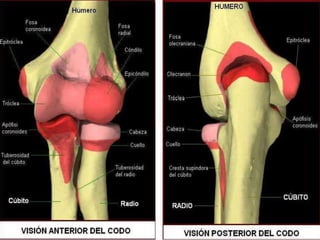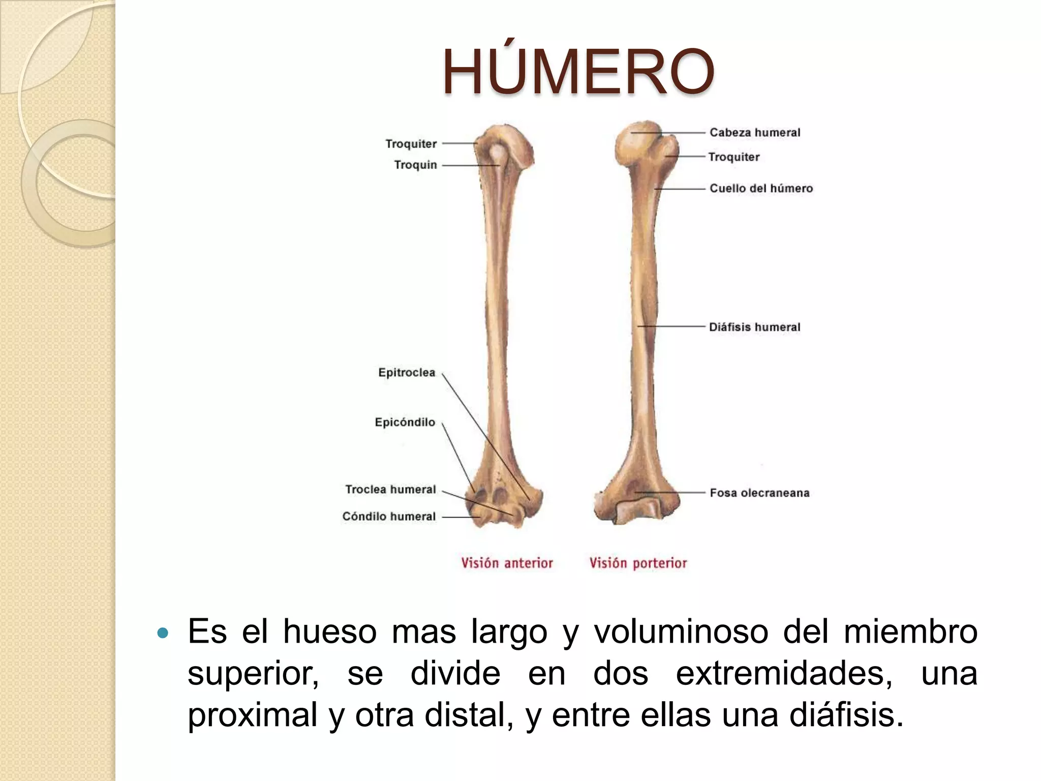 El húmero es el hueso más largo del brazo. Se divide en dos extremidades - proximal y distal - unidas por la diáfisis. La extremidad proximal tiene una cabeza redonda que se articula con la escápula y dos tuberosidades para la inserción de músculos. La extremidad distal tiene un condilo, dos epicondilos y tres fosas. Diversos músculos se insertan a lo largo del húmero para permitir el movimiento del brazo.