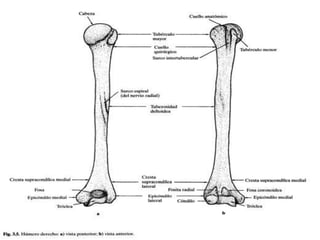 El documento presenta una descripción detallada de la osteología del húmero, incluyendo sus partes anatómicas principales como la cabeza, cuello, tubérculos mayor y menor, surco intertubercular, diáfisis y epífisis proximal y distal. Explica las características de cada una de estas partes y su importancia clínica.
