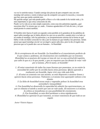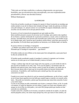 El documento presenta la historia de un hombre rico que se acerca a un mendigo en el parque. Cuando le pregunta al mendigo qué desearía para su cumpleaños, el mendigo responde que ya ha tenido todo lo que necesita en la vida, como amor familiar, amor de pareja y la capacidad de ayudar a otros. El mendigo se da cuenta de que ya tiene todo lo que necesita para ser feliz y está agradecido por lo que tiene. Esto le enseña al hombre rico sobre la importancia de la humildad.