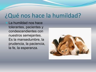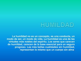 La humildad es una virtud noble que consiste en conocer las propias limitaciones y debilidades. Comportarse con humildad significa ser tolerante, paciente y condescendiente con los demás. Aquellos que cultivan la humildad logran vivir una vida más feliz y en armonía.