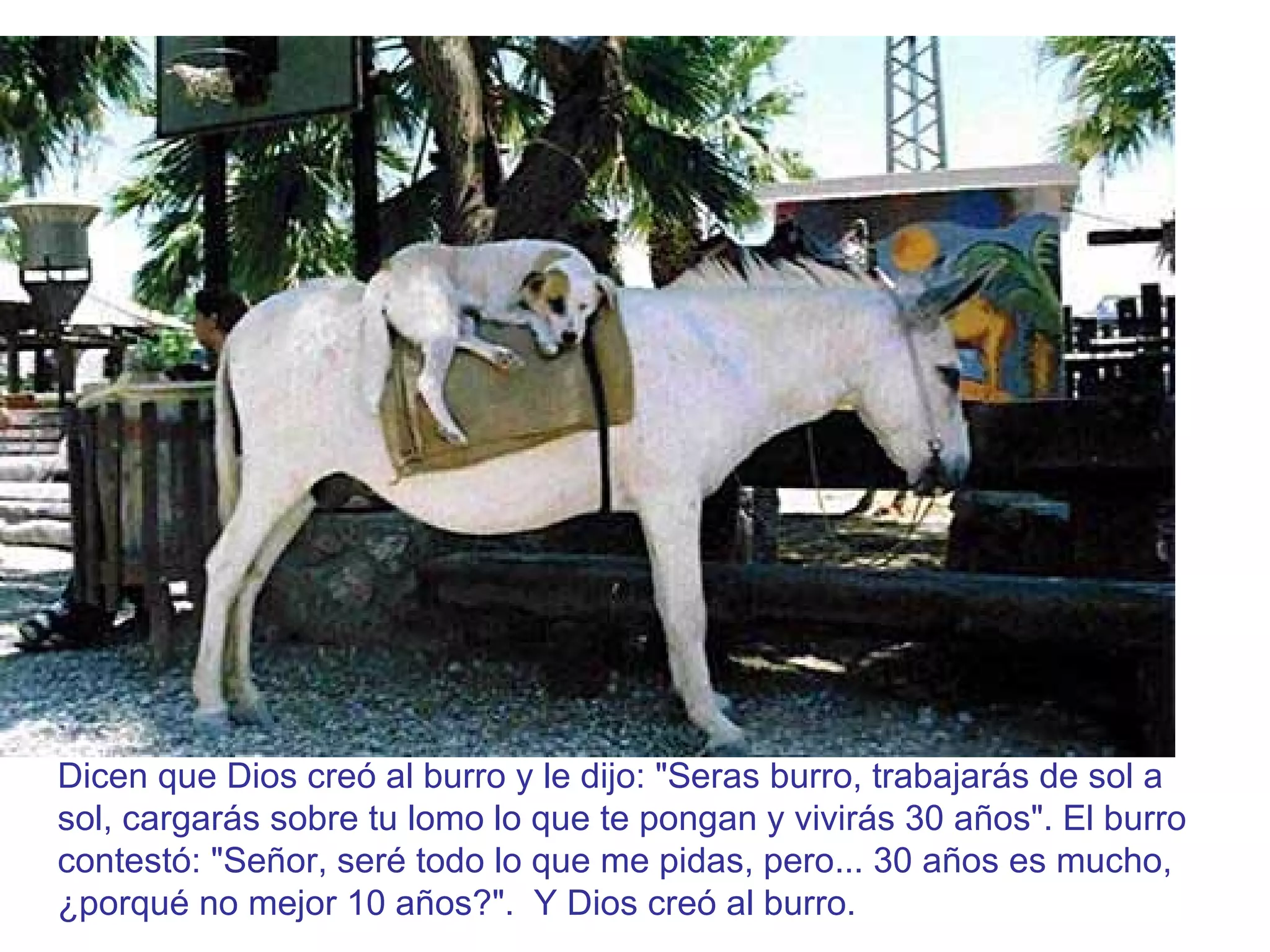 El documento cuenta una fábula sobre cómo Dios creó al burro, perro, mono y hombre. Cada criatura negoció su esperanza de vida con Dios, pidiendo menos años de los que Dios propuso inicialmente. Al crear al hombre, este pidió los años extras que las otras criaturas no quisieron, resultando en que el hombre viva una vida que refleja las de un burro, perro y mono.
