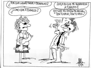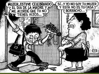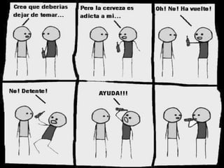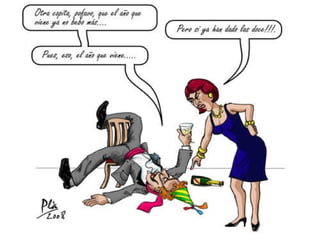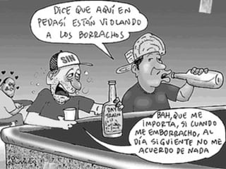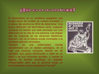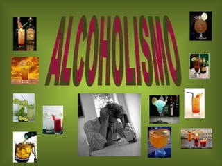 Este documento trata sobre el alcoholismo y los efectos del consumo de alcohol. Define el alcoholismo como un patrón de consumo que causa daño a la salud o interferencia con la vida diaria de una persona. Explica que el alcoholismo es un proceso que va desde el consumo social hasta la adicción completa, y que puede ser causado por factores genéticos y ambientales. Finalmente, detalla los posibles efectos agudos y crónicos del consumo de alcohol, tanto en pequeñas como en grandes cantidades.