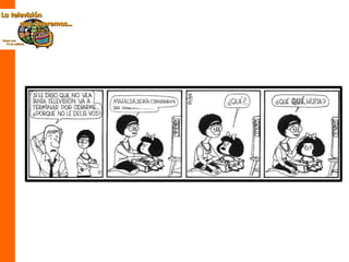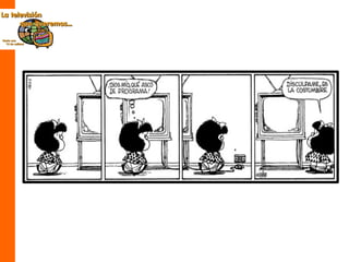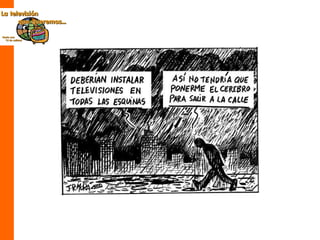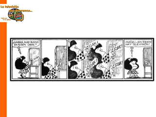 El documento presenta un resumen ficticio de un programa de televisión de 6 horas sobre la sociedad sedentaria y una cámara oculta que filma a una persona que pasa todo el día viendo televisión. Contiene bromas sobre la importancia de la lectura y sobre perdonar a alguien una vez que se vea algo deseable en un canal de compras.
