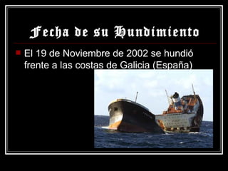 El 19 de noviembre de 2002, el petrolero Prestige se hundió frente a las costas de Galicia, España, vertiendo 77,000 toneladas de fuel que contaminaron Galicia, País Vasco, Asturias y Cantabria. El hundimiento fue causado por las fuertes tormentas y olas y tuvo graves consecuencias ecológicas y económicas para España, afectando la vida marina y la salud de cientos de miles de voluntarios que participaron en la limpieza. El combustible derramado fue extraído del casco hundido del barco