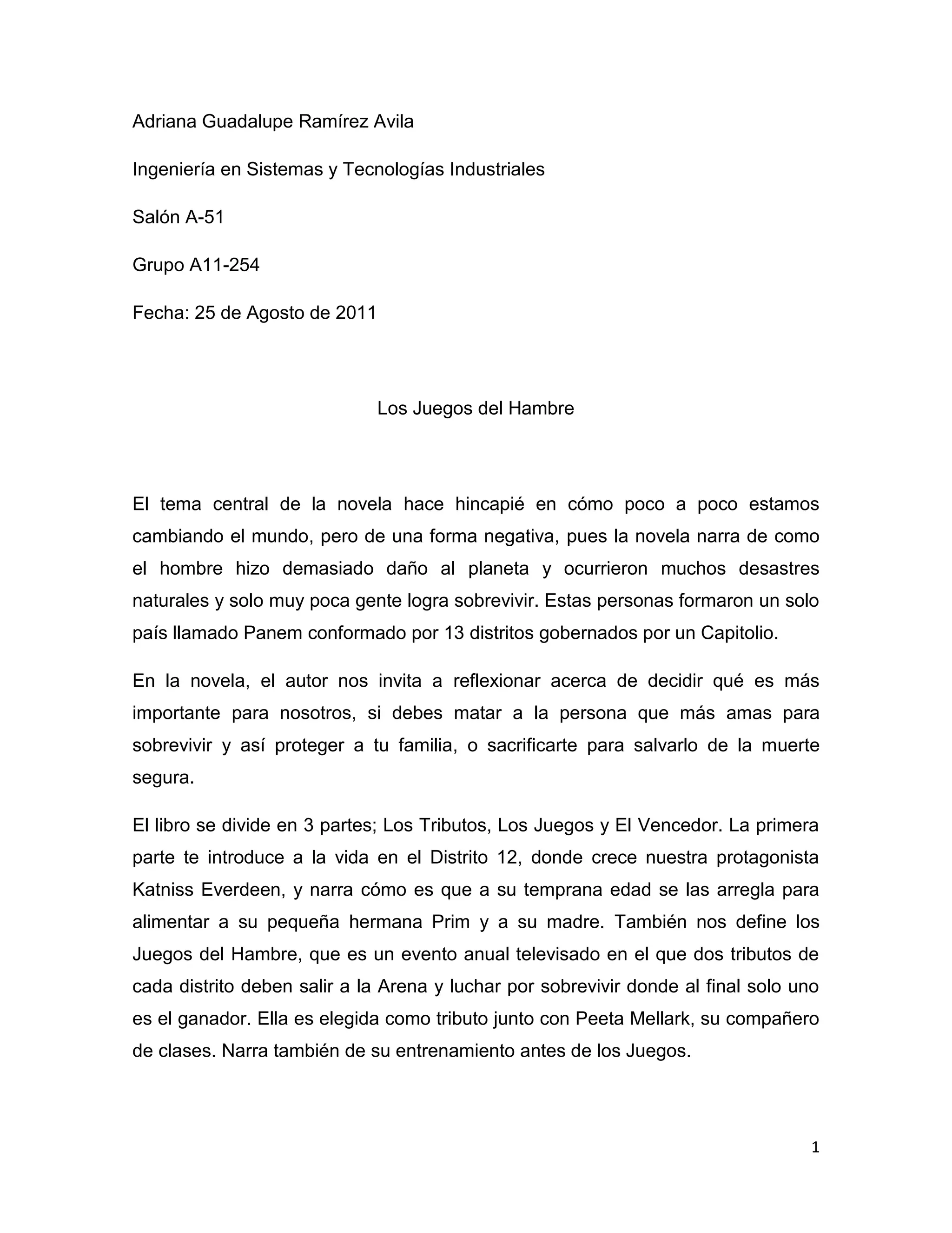 El documento resume la novela "Los Juegos del Hambre" de Suzanne Collins. Narra cómo en un futuro distópico luego de desastres ambientales la humanidad vive dividida en distritos gobernados por el Capitolio. Cada año, dos tributos de cada distrito deben participar en los Juegos del Hambre, un evento televisado donde solo puede quedar un ganador. La protagonista Katniss se ofrece voluntaria para salvar a su hermana de ser tributo y compite junto a Peeta. Al final, ambos ganan gracias a un acto de