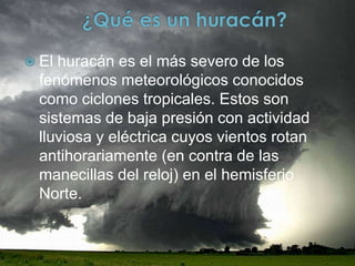 El documento describe los diferentes niveles de huracanes según la velocidad del viento, desde una depresión tropical con vientos de hasta 63 km/h hasta un huracán de categoría 5 con vientos de más de 249 km/h. Explica también que los huracanes se forman sobre el mar cuando ondas de calor crean nubes de tormenta que giran en espiral de forma antihoraria en el hemisferio norte, y que pueden causar grandes daños a su paso como pérdidas humanas, de recursos y de viviendas.