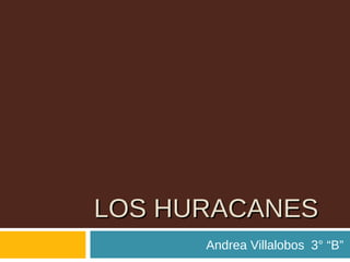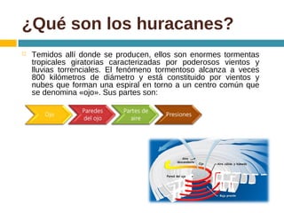 El documento describe los huracanes, incluyendo que son enormes tormentas tropicales giratorias con poderosos vientos y lluvias torrenciales que pueden alcanzar 800 km de diámetro. Se forman sobre los océanos Atlántico, Pacífico e Índico y azotan las islas del Caribe y las costas de Norteamérica, causando muerte y destrucción.