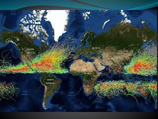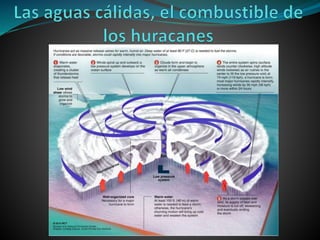 Este documento presenta información sobre tormentas tropicales y huracanes, incluyendo la escala de intensidad de Saffir-Simpson, temperaturas óptimas para su formación, y daños económicos y muertes causadas por algunas tormentas entre 1990-2003.