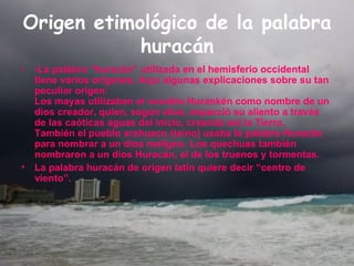 La palabra huracán proviene de varias culturas antiguas como los mayas y arahuacos y tiene diferentes orígenes etimológicos. Los huracanes se forman sobre aguas cálidas del océano cuando se genera una baja presión atmosférica y entra aire más frío en las capas altas. Suelen girar en sentido antihorario en el hemisferio norte y horario en el sur.