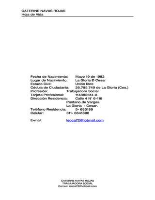 Este documento es la hoja de vida de Caterine Navas Rojas, una trabajadora social colombiana. Presenta su información personal y profesional, incluyendo sus estudios universitarios y posgrados, experiencia laboral en cargos relacionados con el trabajo social, y referencias personales y laborales.
