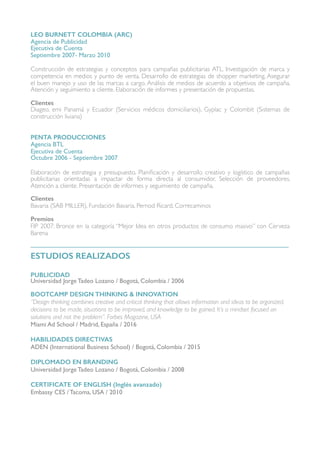 La candidata tiene 9 años de experiencia en agencias de publicidad liderando equipos de cuentas y desarrollando estrategias de comunicación. Ha trabajado para marcas como Nestlé, Masterfoods y Claro, ganando premios por sus campañas digitales y de promociones. Actualmente busca nuevos retos donde pueda aplicar su pensamiento de diseño e innovación para crear soluciones valiosas para los usuarios.