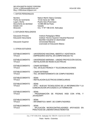 Este documento es el currículum vitae de Nelson Martín Sáenz Córdoba, que incluye su información personal, educación, experiencia laboral y referencias. Sáenz tiene varios títulos técnicos y universitarios y más de 20 años de experiencia docente y técnica en electrónica, sistemas, electricidad y mantenimiento de computadoras.