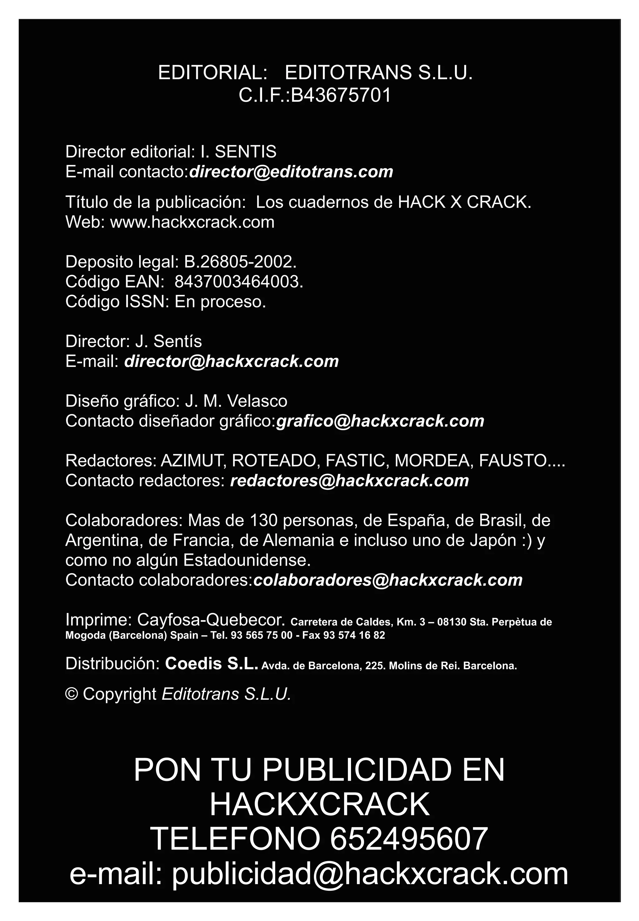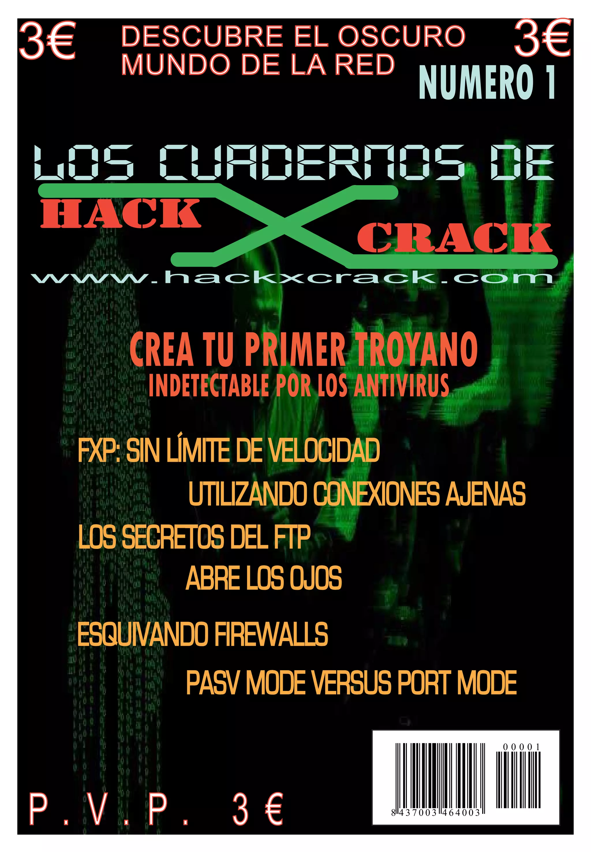 Este documento es la primera edición de una revista llamada "Los cuadernos de HACK X CRACK". La revista busca educar a los lectores sobre temas relacionados con la tecnología y la seguridad informática de una manera ética. Incluye artículos sobre cómo crear un troyano indetectable, utilizar conexiones FTP ajenas, y esquivar firewalls. La editorial declara que el objetivo de la publicación no es fomentar actividades ilegales.