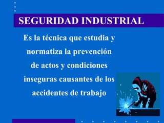 El documento habla sobre la seguridad e higiene industrial. Explica que la seguridad industrial estudia la prevención de accidentes y es responsabilidad de todos los miembros de una organización. También describe las enfermedades profesionales, accidentes de trabajo, sus causas y factores de riesgo. Además, aborda temas como la contaminación ambiental, residuos peligrosos y el estrés laboral.