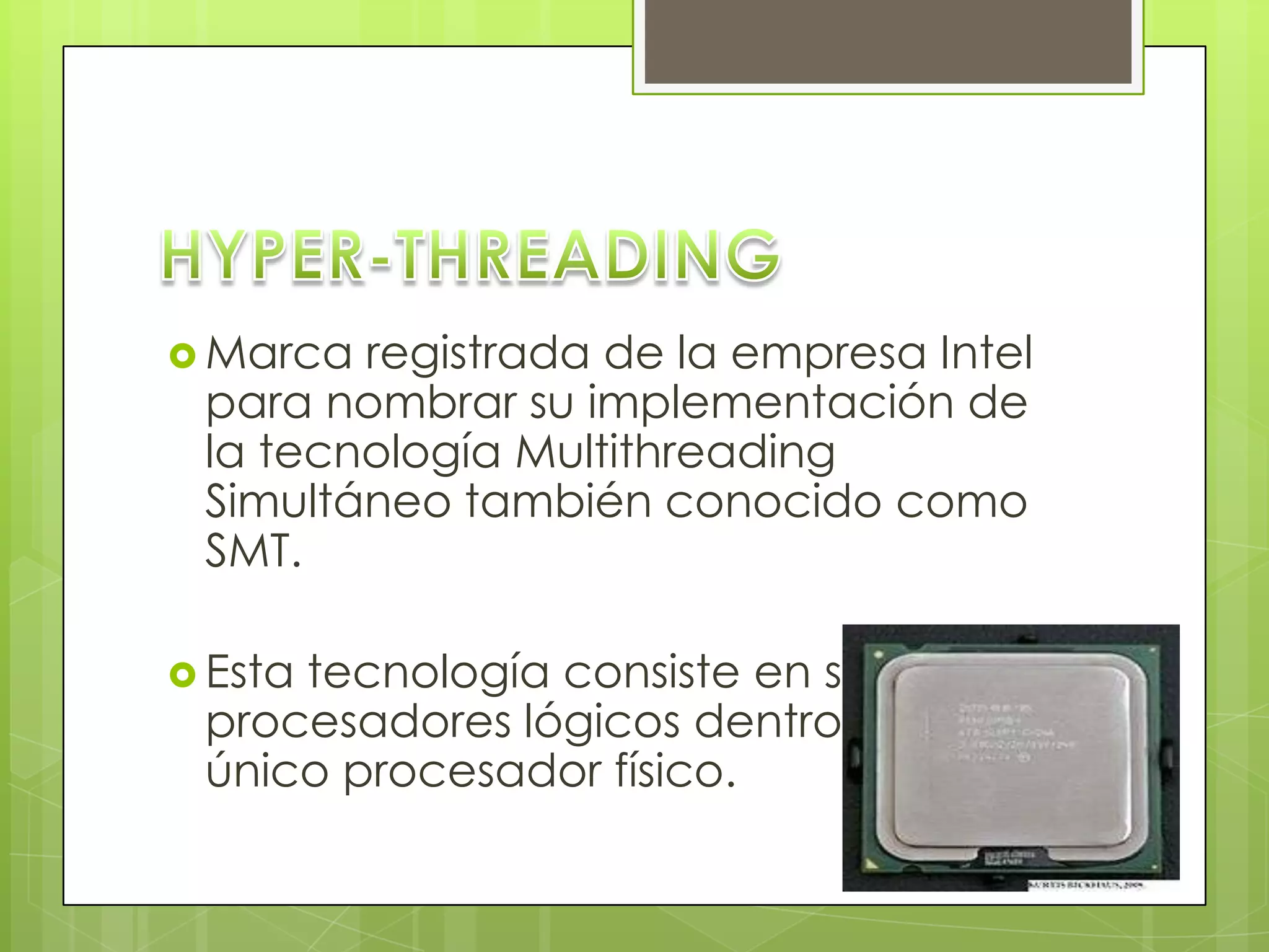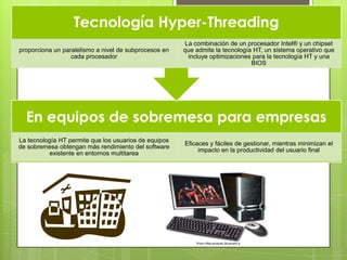 La tecnología Hyper-Threading de Intel simula dos procesadores lógicos en un solo procesador físico para mejorar el rendimiento en aplicaciones multitarea. Esta tecnología, cuando se combina con procesadores dual-core como el Pentium Extreme Edition, permite ejecutar juegos con gráficos avanzados y tareas en segundo plano al mismo tiempo para una experiencia de usuario más fluida.