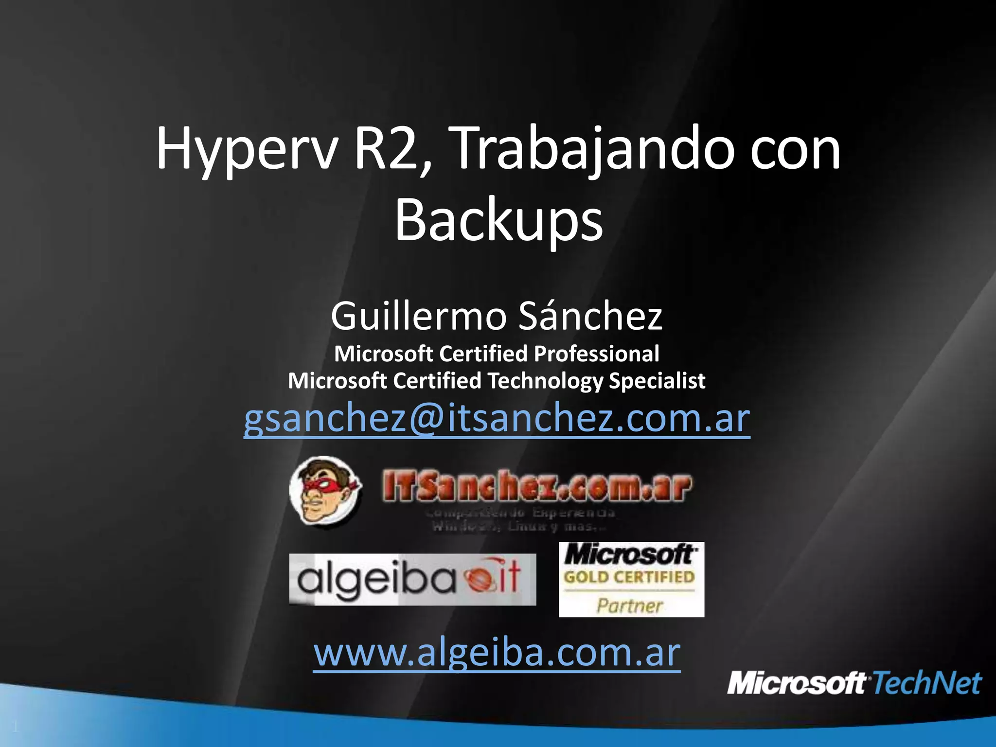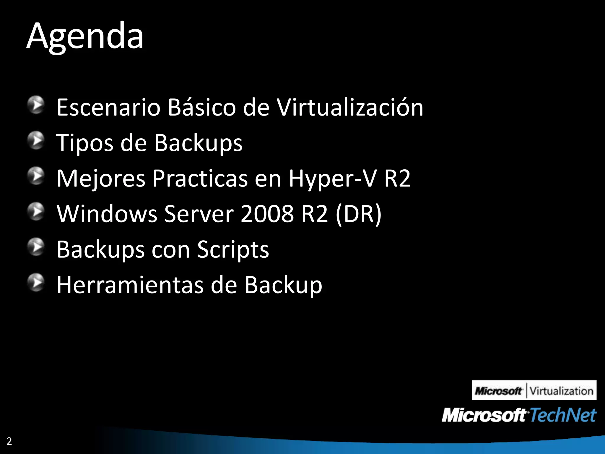 Este documento describe los diferentes tipos de respaldos que se pueden realizar en un entorno de virtualización Hyper-V, incluyendo respaldos del sistema operativo anfitrión, de las máquinas virtuales, y del entorno completo. Explica las mejores prácticas como dedicar una partición exclusiva para el sistema operativo anfitrión, implementar un plan de recuperación ante desastres, y usar herramientas como Windows Server Backup, Data Protection Manager y scripts para automatizar respaldos de máquinas virtuales.