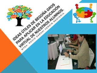 El documento describe el aula virtual como un entorno que proporciona recursos y contenidos para el aprendizaje en línea e interacción entre estudiantes y profesores. Explica que los estudiantes asumen responsabilidad al aprender en línea y que las actividades están diseñadas con objetivos claros. Además, recomienda plantear situaciones de aprendizaje y preguntas para guiar a los estudiantes, y propone varias actividades como ensayos, lecturas comentadas, trabajos matemáticos y de investigación para realizar de forma colabor