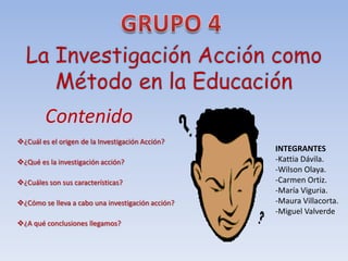 Este documento describe el método de investigación-acción y sus pasos. La investigación-acción es un método utilizado por docentes para resolver problemas prácticos mediante el uso del método científico. Combina conocimiento teórico y práctico. Se lleva a cabo identificando un problema, revisando literatura, planteando preguntas e hipótesis, recolectando datos desde múltiples perspectivas, analizando datos, y compartiendo conclusiones. El objetivo es mejorar continuamente la práctica educativa.