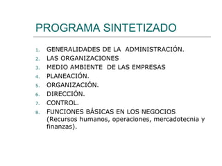 Este documento presenta un programa sobre procesos y teoría administrativa. Incluye una introducción a conceptos generales de administración y las principales teorías y enfoques en la evolución del pensamiento administrativo desde la antigüedad hasta la actualidad, así como un sistema de evaluación basado en exámenes y proyectos.