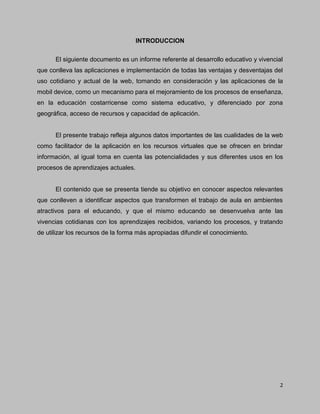 Este documento es un informe sobre el uso de la web y dispositivos móviles en la educación costarricense, centrándose en la propuesta de un proyecto que mejora el aprendizaje comunitario entre estudiantes de sexto grado. Propone un enfoque interactivo que involucra la participación activa de los estudiantes y el uso de tecnologías de la información para realizar investigaciones sobre la historia de su comunidad. Se propone un plan de trabajo de tres semanas que incluye lecciones, entrevistas a líderes comunitarios y la creación de contenidos digitales.