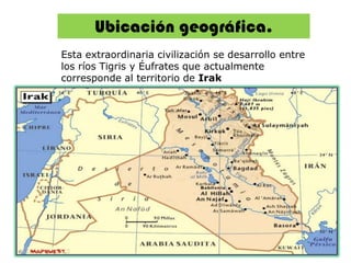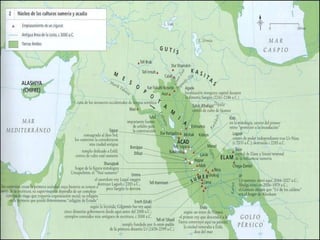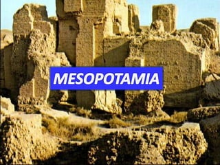 Mesopotamia fue el hogar de varias civilizaciones antiguas que florecieron entre los ríos Tigris y Éufrates. Los sumerios fueron la primera civilización y desarrollaron la escritura cuneiforme. Posteriormente, los acadios, asirios y babilonios dominaron la región. La economía se basaba en la agricultura y el comercio. Los sumerios crearon varios mitos y poemas épicos que explicaban sus creencias religiosas politeístas. La escritura cuneiforme permitió que floreciera la