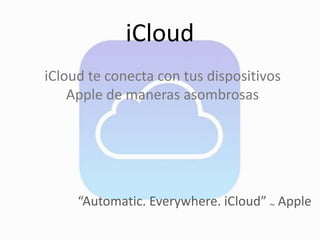 iCloud es un servicio de almacenamiento en la nube de Apple que permite acceder automáticamente a archivos desde múltiples dispositivos. Ofrece diversas opciones de suscripción con almacenamiento gratuito de 5 GB, y diferentes planes de pago según la necesidad de espacio. iCloud es compatible con varias plataformas y aplicaciones, facilitando la creación y acceso a archivos desde dispositivos iOS y otras plataformas.