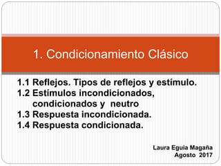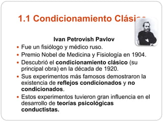 El documento aborda el condicionamiento clásico, una teoría desarrollada por Iván Pavlov que ilustra cómo se aprenden respuestas involuntarias a estímulos nuevos a través de asociaciones repetidas. Se explican conceptos clave como estímulos incondicionados, condicionados, y respuestas incondicionadas y condicionadas, así como la importancia de la intensidad y el refuerzo en el proceso de aprendizaje. Además, menciona a John B. Watson como el primer psicólogo en aplicar las ideas de Pavlov en experimentos con seres humanos.