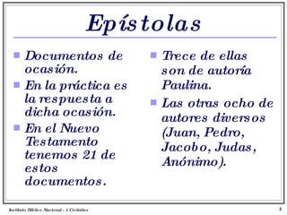 El documento presenta un resumen del contexto histórico y cultural de la ciudad de Corinto y la comunidad cristiana allí establecida. Explica que Pablo escribió la Primera Epístola a los Corintios en respuesta a los problemas que aquejaban a la iglesia, incluyendo divisionismo, inmoralidad e influencias filosóficas y rabínicas. Además, provee evidencia interna y externa para establecer la autoría paulina de la carta, data su escritura entre los años 53-57 d.C. y resume