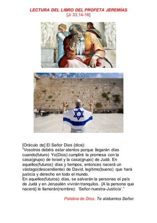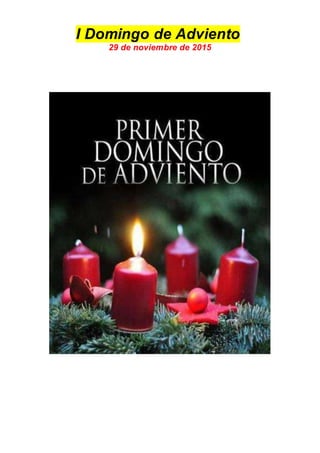 El documento presenta tres lecturas para el primer domingo de Adviento. La lectura del profeta Jeremías habla sobre la promesa de Dios de enviar un descendiente de David que traerá justicia. La lectura de la carta de San Pablo a los Tesalonicenses exhorta a los cristianos a vivir agradando a Dios. La lectura del Evangelio de San Lucas describe los signos que precederán la segunda venida de Cristo y llama a los cristianos a estar preparados.
