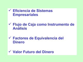 El documento habla sobre factores que influyen en el valor del dinero como la eficiencia de sistemas empresariales, el flujo de caja, factores de equivalencia del dinero y el valor futuro del dinero. Explica conceptos como tasas de interés, capitalización simple, equivalencia temporal del dinero, y provee ejemplos numéricos para ilustrar estos conceptos.