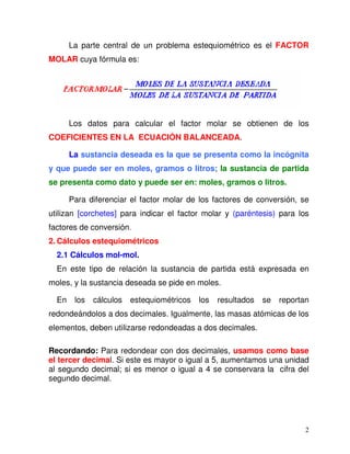 Este documento introduce el tema de la estequiometría. Explica que la estequiometría estudia las relaciones cuantitativas entre los reactivos y productos de una reacción química. Luego, describe los diferentes tipos de cálculos estequiométricos que se pueden realizar, como cálculos mol-mol, mol-gramo, gramo-gramo, entre otros. Finalmente, presenta ejemplos resueltos de problemas estequiométricos para ilustrar cómo aplicar el método de relación molar usando una ecuación
