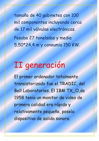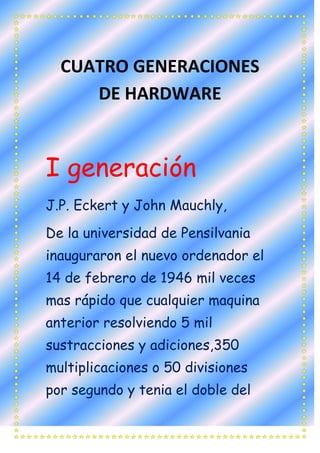 El documento describe las cuatro generaciones de hardware de computadoras. La primera generación incluyó las primeras computadoras como ENIAC que utilizaban válvulas electrónicas. La segunda generación introdujo los transistores. La tercera generación utilizó circuitos integrados a gran escala por primera vez. La cuarta generación incluye circuitos integrados a muy larga escala con millones de transistores en una placa de silicio.