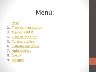 El documento presenta las especificaciones y características del iMac de 27 pulgadas. Incluye un procesador Intel Core i5 de cuatro núcleos con 6 MB de caché y 8 GB de RAM, una pantalla Retina de 2560x1440 píxeles, una tarjeta gráfica NVIDIA GeForce GT 755M con 1 GB de memoria GDDR5, el sistema operativo OS X y aplicaciones integradas. El costo del iMac es de $3.800.000 pesos colombianos e incluye teclado, mouse y cable de corriente