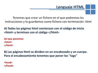 Este documento proporciona una introducción al lenguaje HTML y sus principales etiquetas. Explica cómo crear la estructura básica de una página web con las etiquetas <html>, <head>, <title> y <body>. También cubre cómo dar formato al texto, crear tablas, agregar colores y enlaces hipertextuales.