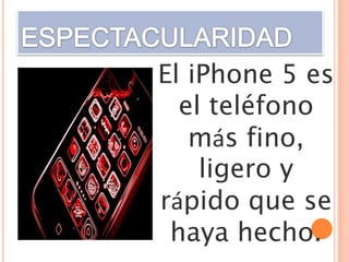 El documento describe las características y especificaciones del iPhone 5, el teléfono más fino, ligero y rápido de Apple. Incluye detalles sobre su diseño, componentes como la cámara de 8 megapíxeles y el chip A6, y precios a partir de 199 dólares. También menciona los auriculares EarPods y su mejor ajuste al oído.