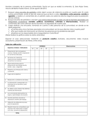 Este documento presenta las instrucciones para un proyecto de educación cívica sobre la construcción de comunidades seguras. Los estudiantes deben trabajar en grupos para investigar un caso de inseguridad ciudadana, realizar encuestas, y presentar un informe escrito y una exposición creativa. El informe debe contener una introducción, desarrollo con evidencia de noticias y encuestas, y conclusiones; y será evaluado según criterios como la presentación a tiempo, el cumplimiento de indicaciones, y la demostración de aprendizajes