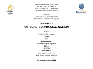 Este documento presenta un protocolo para una prueba de lenguaje como parte de un proyecto para la Licenciatura en Educación Preescolar. Incluye imágenes y ejemplos para evaluar diferentes aspectos del lenguaje como vocales, diptongos, fonemas iniciales, medios y finales, y grupos consonánticos. El protocolo fue elaborado por Beliza Rodríguez Alguera para las profesoras MSc. Esperanza Serrano y Dra. Hellen Roxana Valverde como parte del tercer cuatrimestre de 2012.