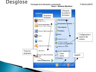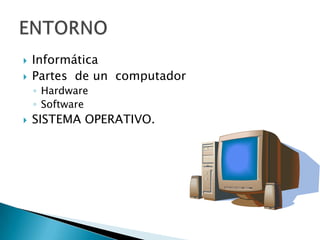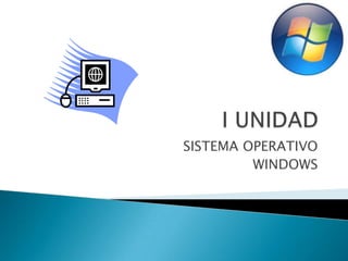 El documento describe las partes principales de Windows como sistema operativo, incluyendo el escritorio, la barra de tareas, el botón de inicio, y las ventanas. Explica que la barra de tareas muestra los programas en ejecución y contiene accesos a opciones como el menú inicio. También describe cómo las ventanas alojan cada aplicación ejecutándose y que demasiadas ventanas abiertas pueden afectar el rendimiento del sistema.