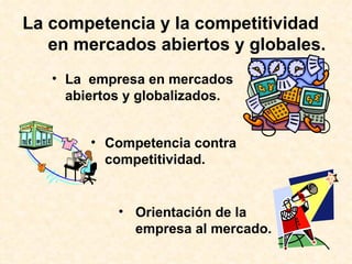 El documento habla sobre estrategias de mercadotecnia y la competencia entre empresas. Explica que la competencia y la competitividad son claves para sobrevivir en mercados globales. También define conceptos como competencia, ventaja competitiva y análisis de competidores. Resalta que orientar la empresa hacia las necesidades del mercado es fundamental para adaptarse al entorno y satisfacer mejor al cliente que la competencia.