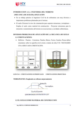 Este documento presenta una introducción a la mecánica de suelos y sus aplicaciones en la ingeniería civil. Explica diversos problemas relacionados con cimentaciones, el uso del suelo como material de construcción, taludes y excavaciones, estructuras enterradas y de retención. También introduce conceptos básicos de geología, clasificación de suelos y tipos problemáticos como suelos expansivos, colapsables, orgánicos y dispersivos. El objetivo es familiarizar a los estudiantes con los fundamentos de la mecánica de suelos y
