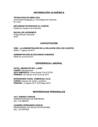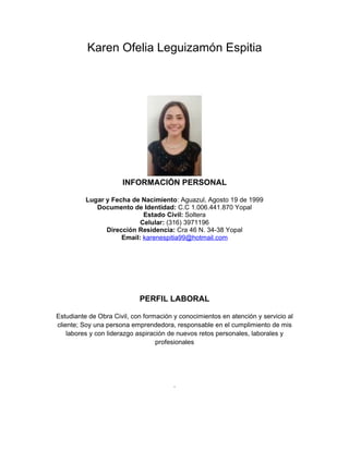 Este documento presenta el perfil profesional de Karen Ofelia Leguizamón Espitia, una estudiante de obra civil nacida en 1999 en Aguazul, Colombia. Actualmente cursa la tecnología en obra civil en la Universidad Pedagógica y Tecnológica de Colombia y ha tomado cursos en servicio al cliente y recursos humanos. Su experiencia laboral incluye trabajos como recepcionista en un hotel y asesora de ventas.