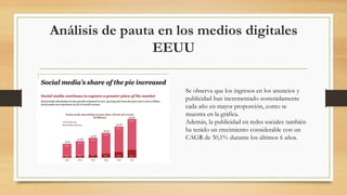 El documento compara las tendencias de publicidad digital en Estados Unidos y Colombia. En ambos países, la publicidad en internet ha aumentado significativamente, mientras que la publicidad en televisión, revistas y periódicos ha disminuido. Sin embargo, en Estados Unidos el medio B2B también es importante, a diferencia de Colombia donde no tiene mucha relevancia. La publicidad móvil tiene un fuerte crecimiento en ambos países.