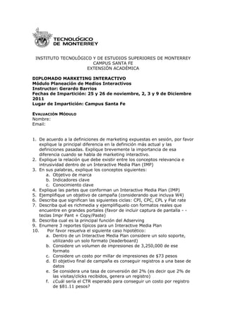 Este documento presenta la información sobre un diplomado de marketing interactivo que se llevará a cabo en el Instituto Tecnológico y de Estudios Superiores de Monterrey campus Santa Fe entre noviembre y diciembre de 2011. Incluye una evaluación de 10 preguntas sobre conceptos clave de marketing interactivo como objetivos de marca, indicadores clave, ciclos de costo por clic, rich media, reportes de medios interactivos y un caso hipotético para calcular una tasa de clic esperada.
