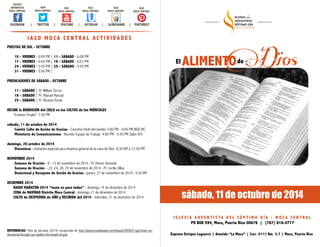El documento es un boletín de actividades de la Iglesia Adventista de Moca Central para octubre y diciembre de 2014, destacando eventos como cultos, semanas de oración y limpieza general. Incluye horarios de puestas de sol, predicadores, y detalles sobre el culto de acción de gracias y la cena de Navidad. Se menciona también la lección de la Escuela Sabática y actividades específicas para cada día.