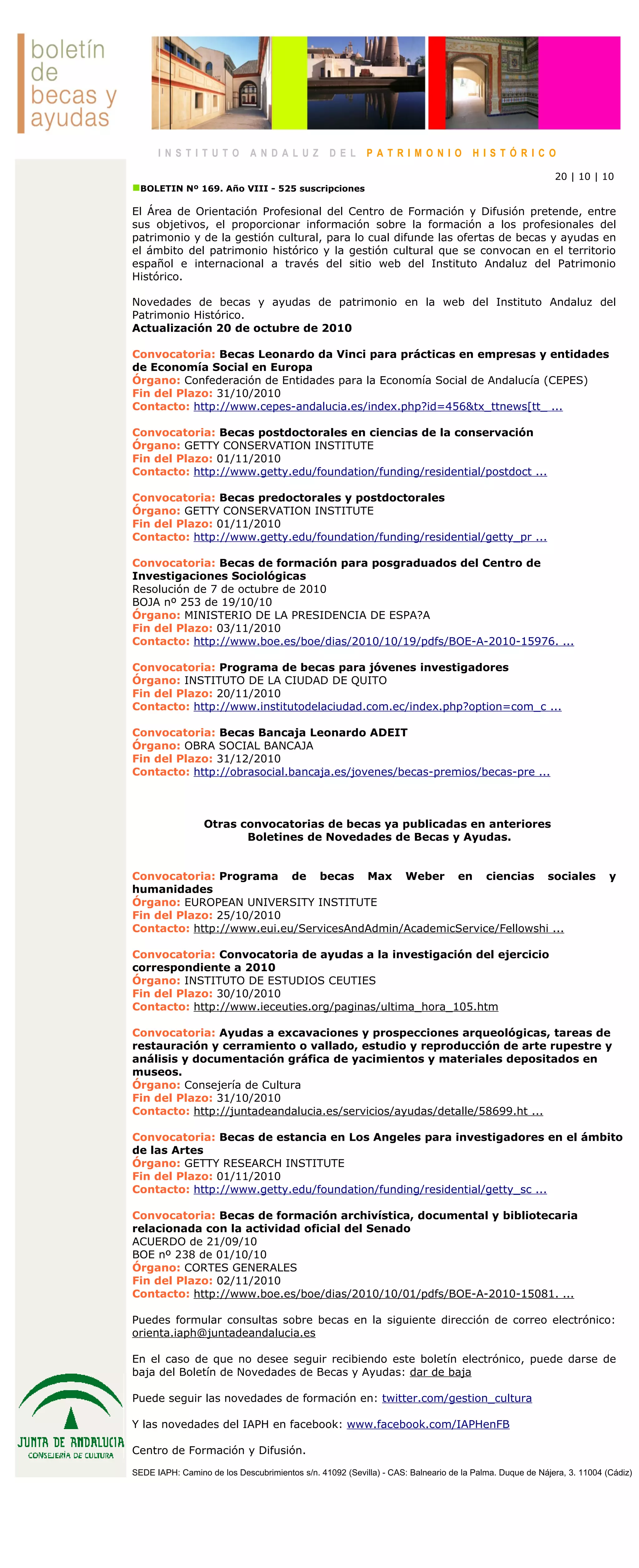 El boletín del Instituto Andaluz del Patrimonio Histórico anuncia varias convocatorias de becas y ayudas para la formación y la investigación en patrimonio cultural y gestión, incluyendo becas Leonardo da Vinci, becas postdoctorales en conservación del Getty Conservation Institute, y becas de formación para posgraduados del Centro de Investigaciones Sociológicas. El boletín también incluye enlaces a más información sobre cada convocatoria.